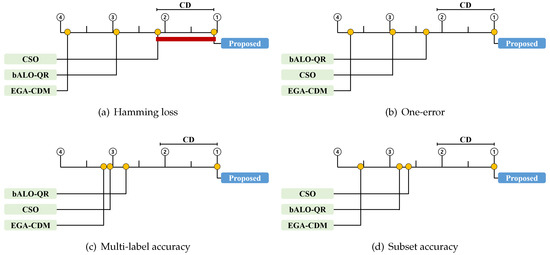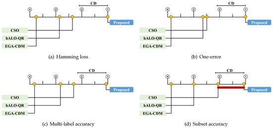 From the results in Table 4, Table 5, Table 6, Table 7, Table 8, Table 9, Table 10 and Table 11, it is evident that the proposed method outperformed the state-of-the-art feature selection methods for most of the multi-label text datasets. For MLNB, the proposed method achieved the highest performance on 94% of the datasets in terms of Hamming loss, and on all datasets in terms of one-error, multi-label accuracy, and subset accuracy. For ML-ELM, the proposed method achieved the highest performance on all datasets in terms of Hamming loss and one-error, and on 94% of the datasets in terms of multi-label accuracy and subset accuracy. Consequently, the proposed method consistently achieved the highest average rank in all the experiments. As shown in Figure 2, the proposed method significantly outperformed all other algorithms in terms of one-error, multi-label accuracy, and subset accuracy for MLNB. As shown in Figure 2a, the proposed method was significantly better than EGA-CDM and bALO-QR in terms of Hamming loss for MLNB. Figure 3 shows that the proposed method significantly outperformed all the other algorithms in terms of Hamming loss, one-error, and multi-label accuracy for ML-ELM. Figure 3d shows that the proposed method is significantly better than EGA-CDM and bALO-QR in terms of the subset accuracy for ML-ELM.