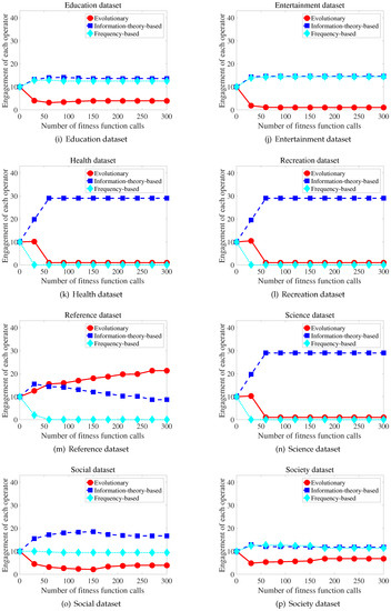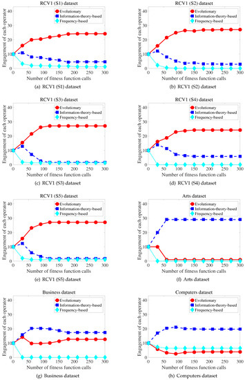 To describe the competition results for each iteration, Figure 4 shows the engagement of each operator during the search process. Here, each engagement is represented as the average across 10 experimental trials with MLNB. Specifically, the engagement refers to the number of times an evolutionary operator and two filter operators modify the particles in each iteration. As shown in Figure 4, the effectiveness of the operators could be varied according to the progress of search on a specified dataset. This indicates that the capability of evolutionary search and the performance of a filter method could vary. Such situations could be intensified in text applications owing to the sparsity of the data. Figure 4a–e shows that the filter operator could rapidly improve the particles on the RCV1 dataset in the early stages of the search process. Additionally, Figure 4m shows that the information-theory-based filter operator is more frequently engaged than the evolutionary operator in the early stages when the reference dataset was used. However, the information-theory-based filter operator was more frequently engaged than the evolutionary operator across the entire search process on the dataset in Figure 4f–l,n–p. Moreover, the frequency-based filter operator was more frequently engaged than the evolutionary operator on the dataset in Figure 4h–j,o–p. In addition, the information-theory-based filter operator was more frequently engaged than the frequency-based filter operator on 81% of the datasets in Figure 4. This demonstrates the superiority of the information-theoretic measure in improving the search capability.