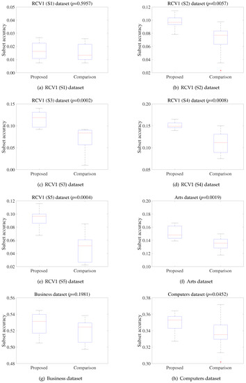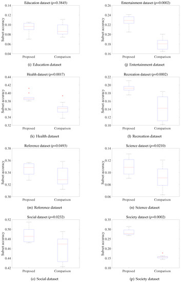 Figure 5 compares the subset accuracy of the proposed and reference algorithm on 16 datasets using MLNB. In Figure 5, the vertical axis indicates the subset accuracy. To determine whether the two methods were statistically different for each dataset, we conducted a Wilcoxon rank sum test [49]. The corresponding p-values are shown in each subfigure. The test used the results from 10 repeated experiments on each dataset. As shown in Figure 5, the additional experiments demonstrate that the competitive engagement of the operators could improve the search capability.