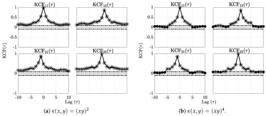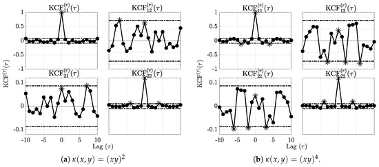 Figure 1. The sequence kernel correlation functions (KCF ( τ ) ) respectively for the quadratic and quartic kernels are contained in Figure 1a,b for Example 1. Horizontal dashed lines represent 95 % significance threshold interval out of which the null hypothesis H 0 of no correlation is rejected. Asterisks (*) further stress signficant values.