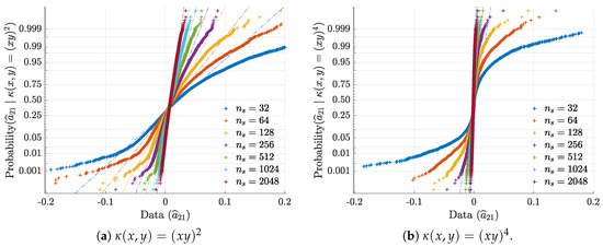 To illustrate and confirm the Gaussian asymptotic behaviour discussed in Section 2.1, normal probability plots for a ^ 21 are presented in Figure 3. Further objective quantification of the convergence speed towards normality is provided by the evolution towards 1 of the Filliben squared-correlation coefficient [22,23,24] as a function of n s (Figure 4).