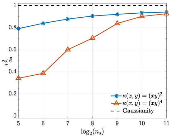 Under the quadratic kernel and employing kernelized Hannan–Quinn information criterion (27) (see Figure 10), one can see that the estimated model order is p = 3 as expected judging from the x 2 2 ( n 3 ) term in (49). In addition, kernelized Granger causality detectability improves with record length n s increase (Figure 11).