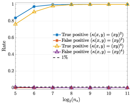 Figure 5. True positive and false positive rates from the kernelized Granger causality test for various samples sizes ( n s ) for α = 1 % . Note that the false-positive-rates for both kernels overlap.