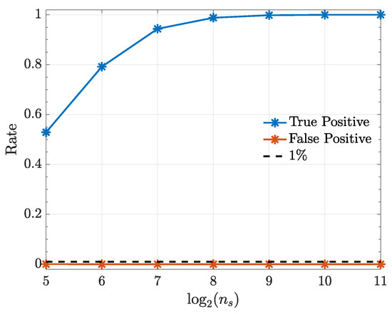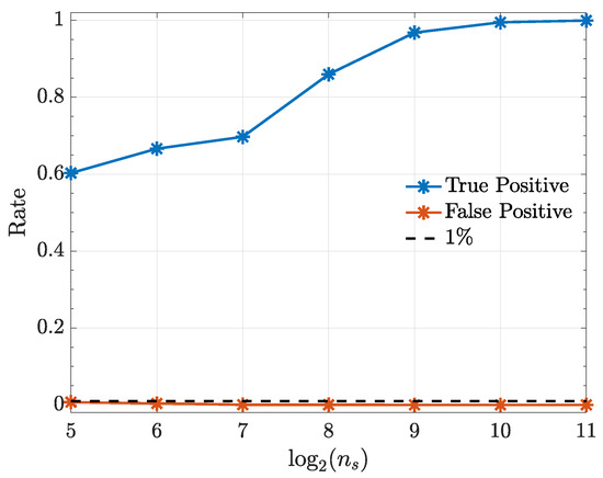 Figure 8. True positive and false positive rates from the kernelized Granger causality test under a quadratic kernel as function of record length n s in Example 4.