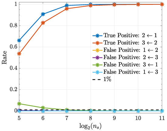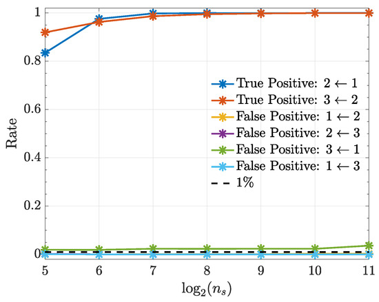 Figure 7 shows that connection detectability improves as signal duration n s increases except for the nonexisting x 3 ( n ) x 1 ( n ) connection whose performance stays more or less constant with a false positive rate slightly above α = 1 % . All computations used quadratic kernels.
