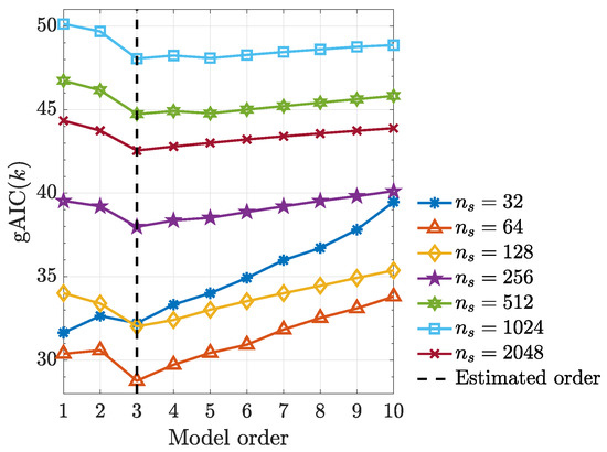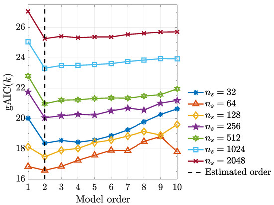 Figure 10. Generalized Hannan–Quinn criterion ( g AIC ( k ) ) as a function of model order for the various data lengths n s from a typical realization from (49).