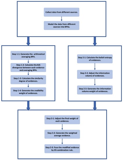 To address the problem of fusing highly-conflicted evidence, a new combination method is proposed in this section. To allocate the weight on evidence more properly, not only credibility of the evidence but also its information volume is taken into consideration. The procedure is divided into three parts. Firstly, the credibility weight of evidence is obtained after transforming BJS divergence into similarities. Secondly, the information volume weight of evidence is obtained by calculating the belief entropy. Thirdly, the weighted average BPA is generated before fusing it by DS combination rule. The flowchart of the method is shown in Figure 1. More details and explanations about each step of the method are described as follows.