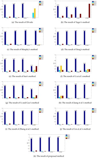 Table 4 and Figure 3 show the results of fusing five BPAs by applying the proposed method, together with the other existing combination rules. Here, a threshold is set based on [54]. After fusing by the combination method, if , it means that the method recognizes fault successfully; otherwise, this combination rule cannot identify what kind of fault and “unknown” is marked in Table 4.