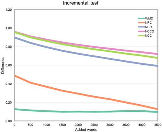 Incremental test to evaluate accuracy. We compare file1 with file2, then, we incrementally add words from the second file to the first one. As expected, the difference softly decays when measuring NRC. On the other hand, WMD does not behave as expected, and the difference remains flat, and in some cases, it even grows. NCD, NCCD, and NCC, also behave well in this test.