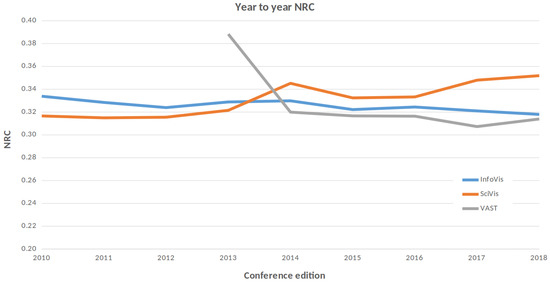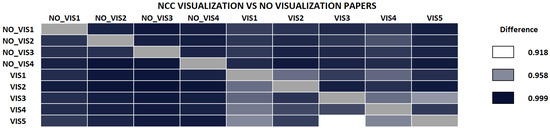 We also performed the same comparison with NCC, shown in Figure 6. Compared to the previous case, though the measure separates well some of the visualization papers from other papers, some of them are not properly classified, such as VIS3, VIS4, and VIS5 papers. NCC value between VIS2 and VIS3 (see column VIS3) is larger than NCC between all non-visualization papers and VIS3. The same happens with VIS5 versus VIS2 in the same direction. We also tested the same dataset with NCD, and, though the difference values are sometimes smaller between visualization and non-visualization papers, the number of papers misclassified is larger than with NRC, NCCD, or NCC. In the following, we have mostly concentrated on the NRC, although NCC behaves similarly in most cases. When necessary, we note the differences.