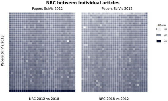 To ensure that our system was going beyond author style classification, we performed the following experiment: We took several visualization papers of different authors on volume rendering. The papers belong to the authors’ initial research, since they are published during the PhD thesis development. Therefore, they have lots in common (typically a coarse research field), and most likely, are going to have the author’s own writing style. We process the papers with the aforementioned pipeline, and calculate the NRC among all of them. Then, we evaluate the differences (in both directions) among the papers.