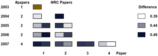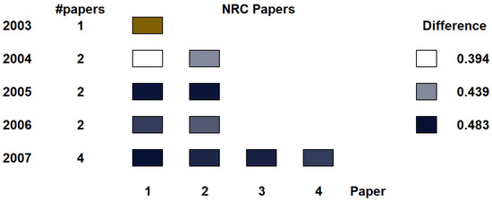 It turns out that comparing the papers using NRC on our dataset does not find smaller differences papers based on its author (or for authors belonging to the same institution), but more in line with its contents. Of course, some papers of the same author have very small differences because they are very closely related, and we cannot discard that the authorship is there, though at a lower proportion. However, other papers score higher than with respect to other authors. Please note that even a manual accurate selection on what two papers are closest to each other is, when papers are on a similar subject, very difficult to achieve. Though the style of an author may change from year to year, this test seems to confirm that NRC is able to approximate the level of novelty (and probably the inherent part of author evolution). Therefore, it seems that NRC, together with the data processing we performed, can effectively help us classify papers based on contents, not on authorship.