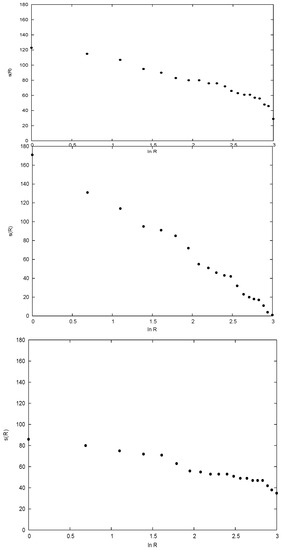 The number of species at sites of rank R plotted against . Upper panel: The data in [7], where the highest rank sites have occupancy ~40 species. Middle panel: The distribution for an underlying exponential for cosmopolitan species; the highest rank sites would have negligible population. Lower panel: The distribution, assuming that sites have receptivity for cosmopolitans similar to the data.
