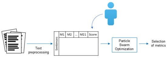 Figure 1 shows the methodology proposed. In each document, entire sections, such as “References” and “Acknowledgments,” were discarded, as well as figures and tables. Then, titles and paragraphs were identified. Each paragraph was split into sentences using the period as delimitator, except when the period was used in numbers and abbreviations. Then, sentences were split into words, stopwords were removed, and, finally, a stemming process was applied. Once all of these pre-processing steps were completed, each of the 16 metrics described in Section 2 was calculated for each sentence, escalating their values between per document.