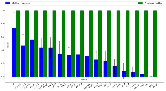 Figure 2 shows the level of metric participation for the two methods being assessed, sorted in decreasing average coefficient order as indicated in Table 2. These coefficients are those used to weight the value of each metric to obtain a score for each sentence. Its value is calculated by averaging the number of times the metric is selected by the obtained particle, as in Algorithm 2 output, among the 30 runs performed. For example, considering the three first values in column “Proposed Method” in Table 2, it can be seen that the corresponding metrics are “tf”, “d_cov_j” and “len_ch,” whose average coefficients are , and , respectively. Therefore, the criterion indicated in Equation (11) does not distinguish between “d_cov_j” and “len_ch”. However, looking at Figure 2, it can be seen that the level of participation of “len_ch” is higher than that of “d_cov_j”. This is because the first has been selected more times by the optimization technique. On the other hand, metric “tf” has the highest average coefficient for the method proposed in Table 2, and also the highest level of participation in Figure 2.