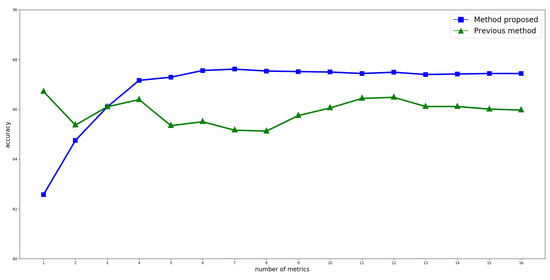 Figure 3 shows how the accuracy of each of the methods evolves as new metrics are added. This is done in the order indicated in Table 2. As it can be seen, the most stable behavior is that of the method proposed here. Additionally, after adding the fourth metric, accuracy becomes remarkably better than that obtained from the method in [23]. Even though the maximum value is observed with the participation of seven metrics, four would be enough to obtain a good performance. It should also be noted that using the method described in [23], even if the resulting accuracy is greater for the two first metrics, the remaining ones yield a poorer result compared to the method proposed, never going above the high value of .