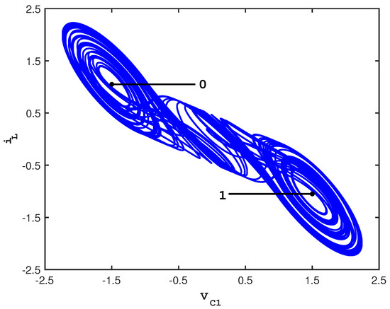 When , , , , , , and , the double scroll system is known to be chaotic, and its attractor consists of two lobes that each surrounds an unstable fixed point [30]. Figure 1 shows a typical trajectory tracing out this attractor.