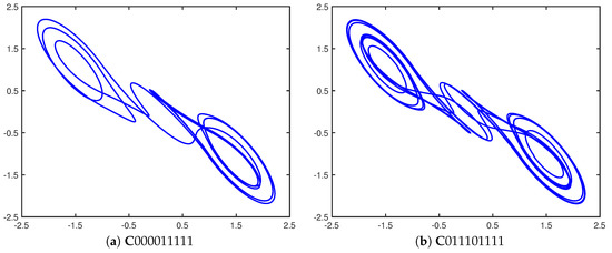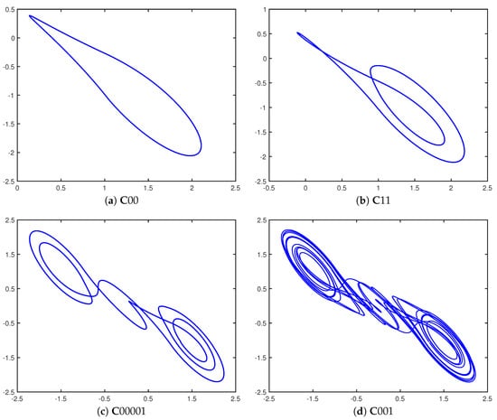 Parker and Short [20] later combined this control scheme with ideas from the study of impulsive differential equations [31] and discovered that when a repeating binary control sequence is used to define the controls, with a ‘1’ bit corresponding to a macrontrol perturbation and a ‘0’ bit corresponding to only a micontrol perturbation, then the double scroll system stabilizes onto a periodic orbit. In fact, the stabilization occurs regardless of the current state of the system or of the starting bit of each repeating control sequence. These periodic orbits have been given the name cupolets, and this work has since been extended to chaotic maps and a variety of other continuous chaotic systems such as the Lorenz and Rössler systems. The examples of double scroll cupolets appearing in Figure 2 are generated by repetitively applying the indicated control sequences to the double scroll system.