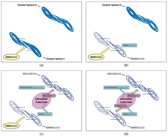 As an example, we will now demonstrate how the two cupolets shown in Figure 3 can become chaotically entangled. This process is also depicted in Figure 4 as a series of step-by-step illustrations. First, two chaotic double scroll systems, Systems I and II, are simulated without control. In order to stabilize one of these cupolets, say , the control sequence ‘000011111’ must be applied to System I using the cupolet-generating control technique described in Section 2. This step is illustrated in Figure 4a, where the depiction of the control planes indicates that Chaotic System I is being controlled via the (yellow) external control pump. Once completes one full period around the attractor, its visitation sequence, , is realized. Figure 4b captures this stage of the entanglement process. This visitation sequence is then passed to an exchange function where it is modified according to a predefined binary operation and transmitted to System II as an emitted sequence. In this example, a ‘preponderance’ exchange function converts into the emitted sequence essentially by interpreting the bits of a visitation sequence as binary energy and imposing an energy threshold on the visitation sequence. This particular type of exchange function is described more thoroughly in [25]. As the emitted sequence passes from the exchange function, it is applied to System II as instructions for controlling this system. In this case, System II stabilizes onto the cupolet since this emitted sequence actually is this second cupolet’s control sequence. These particular steps are depicted in Figure 4c.