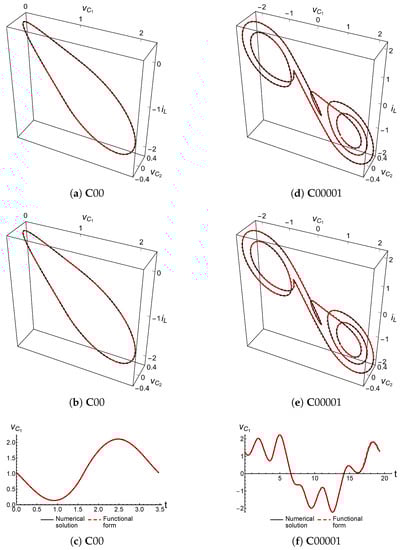 To utilize this representation, the Mathematica software package can be used to compare the functional representation of the dynamical variables with the Mathematica numerical solution of the uncontrolled double scroll equations. Figure 5 shows the comparisons between the numerical solution and the full and truncated functional forms of two cupolets. The first cupolet is the simplest of all, cupolet , with the truncated version using coefficients. The second example uses the 5-loop cupolet , and the truncated version uses . In each case, the magnitude of the Fourier coefficients has diminished by over two orders of magnitude at the point where the series is truncated. Figure 5 also depicts the comparison between the -component of the numerical solution and the corresponding truncated functional form for these cupolets. In all of these figures, the numerical data appear to be superimposed with the data obtained from the cupolets’ functional forms. This is because of how closely the functional forms approximate the cupolet’s true periodic orbit. Note that the orbits of these two cupolets have been seen previously in Figure 2.
