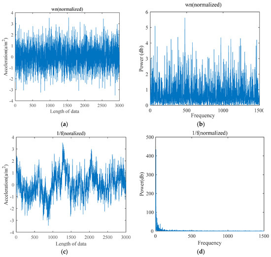 Time domain waveform and power spectrum of WGN and 1/f noise. (a) Time domain waveform of WGN, (b) Power spectrum of WGN, (c) Time domain waveform of 1/f noise and (d) Power spectrum of 1/f noise.