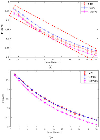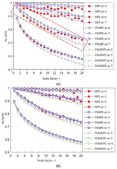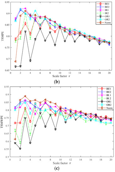 The comparisons of TSMWPE with TSMPE and MPE are made under different embedding dimensions and the results are shown in Figure 3. From the Figure 3, it can be found that the TSMWPE, TSMPE and MPE values of WGN and 1/f noises become smaller and smaller with the increase of m. The TSMWPE, TSMPE and MPE curves for different embedding dimensions are compared in Figure 3a. It can be found that when m = 4, TSMWPE, TSMPE and MPE have larger entropy values from a scale of 1 to 20. It has a small range of variations from 0.95 to 1. The result indicates the smaller the value of parameter m, the fewer types of patterns are produced by each state vector. Even though the occurrence number of state vectors with the same pattern but different amplitudes is relatively small, the occurrence frequency is relatively larger, which causes an increase in the weighted relative probability of each pattern. Eventually the calculated entropy value will inevitably become larger. When m = 6 or 7, there is a large ranges of amplitude changes, which indicates that it can more fully reflect the change process of entropy value on different scale factors relatively to when m = 4 or 5. However, when m = 7, it can be found that there is a great consistency between TSMPE and MPE, and it is difficult to distinguish between MPE and TSMPE. Based on the analysis above, the parameter m = 6 is chosen in TSMWPE, TSMPE and MPE. In addition, it is worth noting that the curve of TSMWPE is significantly more stable than that of MPE, which indicates that TSMWPE exhibits good stability in feature extraction.