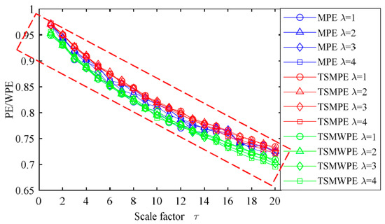- For scale factor , the PEs of each time-shift coarse-grained time series are calculated. The obtained different PEs of each time-shift coarse-grained time series are averaged bywhere m is the embedding dimension and is delay time.