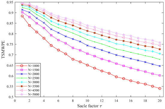 In this subsection, the 1/f noise with lengths of N = 1000, 1500, 2000, 2500, 3000, 3500, 4000, 4500 are set with m = 6 and time delay to determine the effect of parameter N on TSMWPE. The TSMWPE of 1/f noise with different lengths are shown in Figure 5. It can be found from Figure 5 that the TSMWPE curve of 1/f noise shows a slight fluctuation when N 2500 and when N 2500, it appears to be quite stable and has a nearly parallel trend. Therefore, N 3000 is generally selected in the subsequent step.