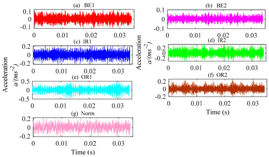 The waveforms of vibration signals of rolling bearings for case 1. (a) BE1; (b) BE2; (c) IR1; (d) IR2; (e) OR1; (f) OR2; (g) Norm.