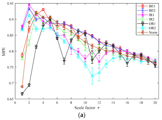 - For the scale factor , permutation entropy of each coarse-grained time series is calculated. Finally, the entropy values of all scales are obtained and seen as a function of the scale factor.