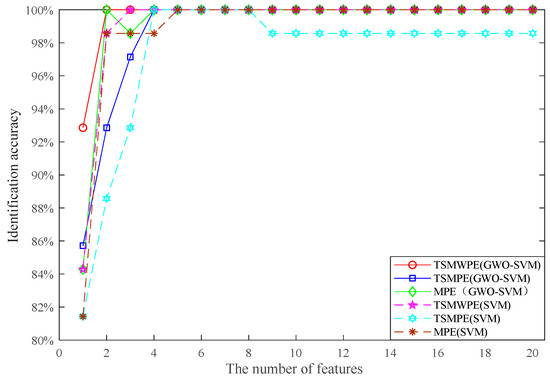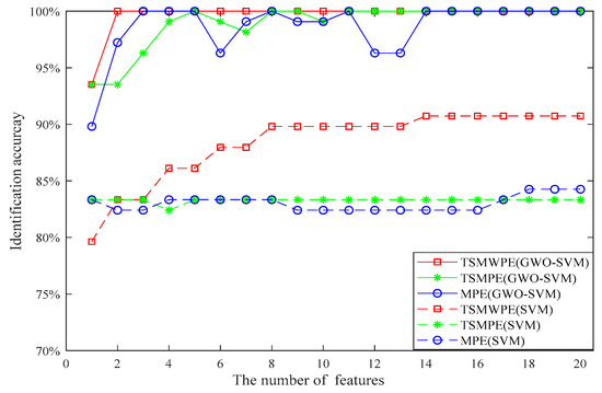 The GWO-SVM in the proposed method was also replaced by original SVM for comparison. Like the above process, the identification accuracy of the TSMWPE, TSMPE and MPE based fault extraction method by combing SVM for classification is given in Figure 16. It can be observed from Figure 16 that for the first eight features, the identification accuracy of the TSMWPE and SVM based method gradually increases from 79.6% to 89.8% then remains at 89.8% from the eighth features to the fourteenth features and at 90.7% from the fourteenth features to the twentieth feature. The identification accuracies of the fault diagnosis method based on TSMPE and SVM are stable at 83.3% when the number of features is larger than 4. The identification accuracy of the MPE and SVM based fault diagnosis method varies from 82.4% to 84.3%. The identification accuracy of GWO-SVM based fault classification is higher than 90%, while that of SVM based multi-classifier is lower than 90% and this indicates the superiority of GWO-SVM to SVM. By observing Figure 16 carefully, it can be found that the GSOSVM is superior to SVM and the proposed TSMWPE and GWO-SVM based fault diagnosis method has higher fault identifying rates than other comparative methods. Generally, we set the number of input number ranging from 5 to 10 for a high diagnosis effect. Therefore, the results above demonstrate the superiority of TSMWPE to TSMPE and MPE in feature extraction, together with that of GWO-SVM to original SVM.