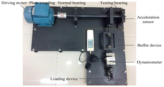 The experimental data of rolling bearing used in this subsection were provided by Soochow University [29,30] to further verify the effectiveness of the proposed method. The test bearing is 6205-2RS deep groove ball bearing and the faulty rolling bearings are machined by a metal electric engraving machine to set a local fault. The spindle speed is 900 r/min and sampling frequency is 10 kHz. The experiment has six different fault classes and locations of rolling bearings, which are listed in Table 5. The test rig of rolling bearing is shown in Figure 13. The operating system includes plum coupling, driving motor, testing bearing, normal bearing, acceleration sensor, buffer device, dynamometer and loading device. Each class of rolling bearing has 28 samples with a length of 4096 points and the vibration signal waveforms of rolling bearing are depicted in Figure 14.