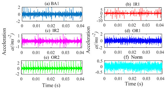 Waveforms of vibration signal of rolling bearing from case 2. (a) BA1; (b) IR1; (c) IR2; (d) OR1; (e) OR2; (f) Norm.