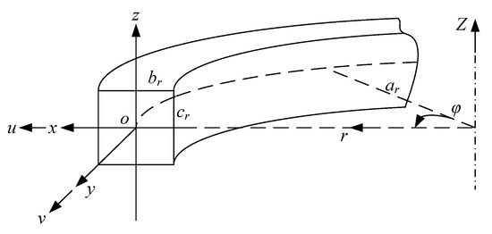 We consider a free boundary ring resonator of rectangular cross-section, Figure 1, with the mean radius ar, the radial thickness br and the axial width cr. A global cylindrical coordinate system (r, φ, Z) and a local Cartesian coordinate system (x, y, z) are defined. u, v and w denote the radial displacement, tangential displacement and translation displacement, respectively. Silicon rings as a common element in MEMS device are capable of both in-plane and out-of-plane flexural vibration. We study only the in-plane vibration in this paper.