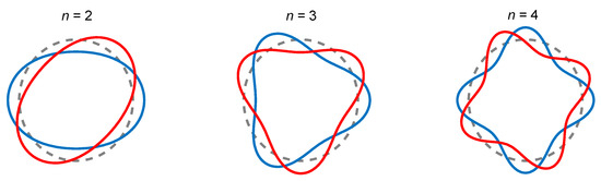 In-plane modes of a ring resonator with mode number n = 2, 3 and 4. The two lines of red and blue in each mode represent an equivalent degenerate pair with a mutual angle of π/2n.