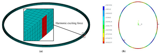 The simulation of FEM for a ring of in-plane vibration with free boundary conditions. (a) Meshing graph of FEM for a ring with exciting force applied on the surface. (b) The results of displacement at the fundamental mode n = 2 of in-plane vibration.
