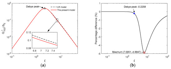 Comparison between LR model and the present model for ring resonators. (a) The normalized thermoelastic damping curves. (b) Percentage difference of thermoelastic damping between LR model and the present model.