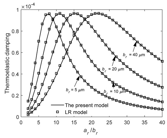 Thermoelastic damping can be obtained from two different ways, mechanical work loss and entropy generation. Zener [6] verified the equivalence of the mechanical work loss method and the entropy generation method. To date, the usual method to derive analytical models of TED in microresonators is calculating the mechanical work loss [22]. However, the entropy generation method is also used to evaluate TED in MEMS devices [13,22,23,24,25]. In previous work [22], we presented analytical models of TED for flexural vibration resonators including microbeams and microplates by using the entropy generation method. These models were proven to be valid and accurate, and so can be used as an alternative to other theories.