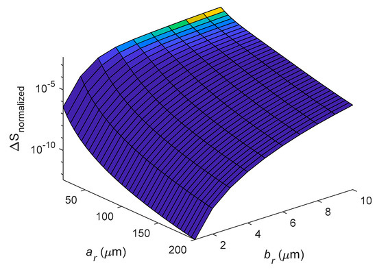 Figure 10 and Figure 11 discuss the relationship of entropy generation, mean radius ar and radial thickness br at different eigenfrequencies. Figure 10 shows the variation of entropy generation ∆S with the mean radius ar for different vibrating modes n. The cross-section of the ring is constant, br = cr = 5 μm. As shown in Figure 10, the entropy generation decreases with increasing mean radius ar for constant n. However, the entropy generation increases with increasing n for constant mean radius ar. Figure 11 shows the variation of entropy generation with br and n for constant cr = 5 μm and ar = 200 μm. As shown in Figure 11, the entropy generation increases with increasing radial thickness br for constant n. Moreover, the entropy generation is monotonically increasing with the mode number n for constant b.