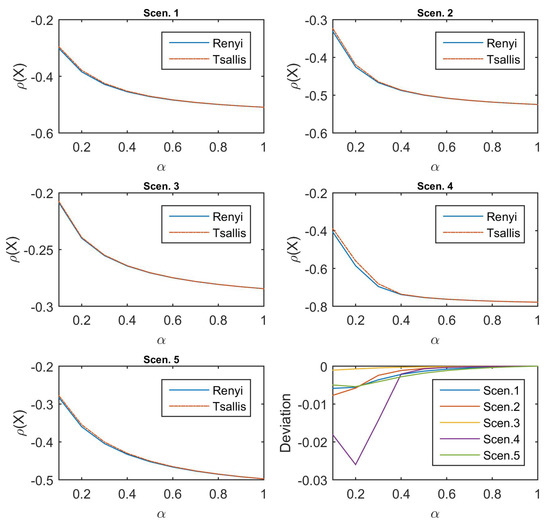 Figure 2 depicts the performance of Rényi-divergence risk measure (the solid line in blue) and Tsallis-divergence risk measure (the solid line in red) under the five scenarios considered, with