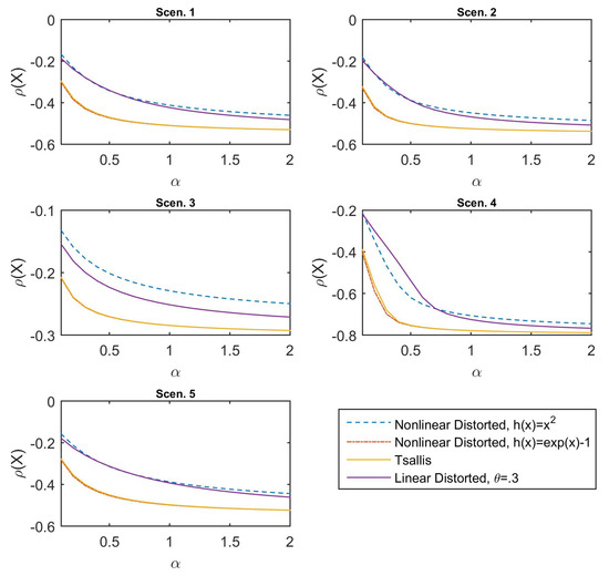 Figure 3. It can be observed that the Tsallis-family risk measures exhibit the same behavior on the declining shapes, the values of which are decreasing for increasing