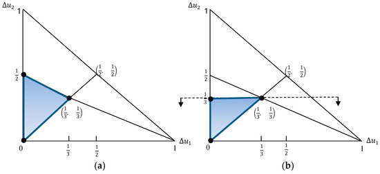 The incorporation of the ordered utility increment vector in the system of constraints of Equation (1) leads to the mathematical program (Equation (4)) and surely restricts the utility simplex as depicted in Figure 1, when considering a case of .