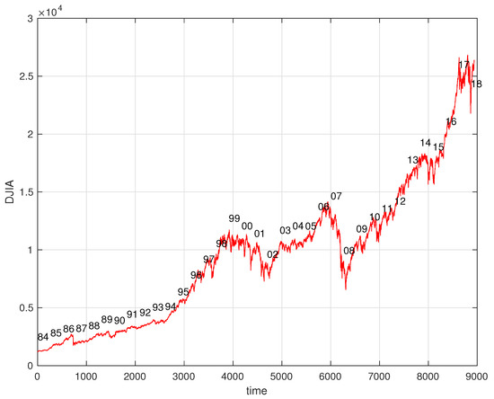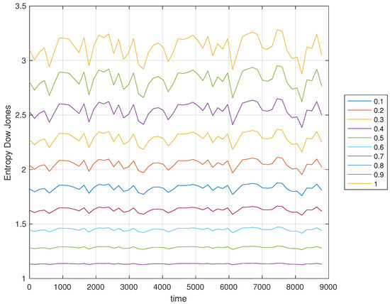 The Dow Jones Industrial Average (DJIA) is an index based on the value of 30 large companies from the United States traded in the stock market during time. The DJIA and other financial indices reveal a fractal nature and has been the topic of many studies using distinct mathematical and computational tools [7,8]. In this section we apply the previous concepts in the study of the DJIA in order to verify the variation of the new expressions with the fractional order. Therefore, we start by analyzing the evolution of daily closing values of the DJIA from January 1, 1985, to April 5, 2019, in the perspective of Equation (3). All weeks include five days and missing values corresponding to special days are interpolated between adjacent values. For calculating the entropy we consider time windows of 149 days performing a total of years.