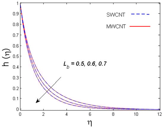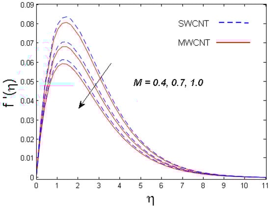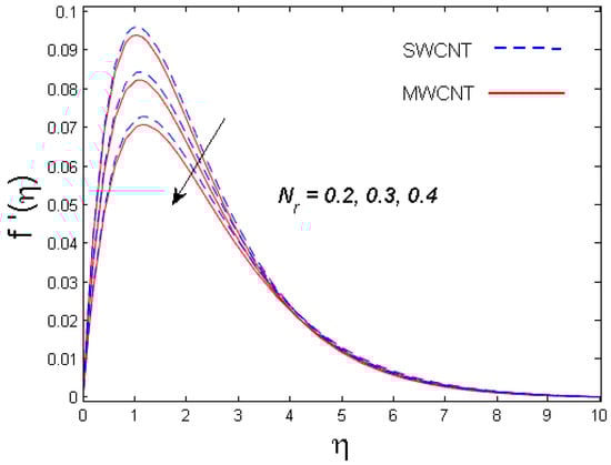The trend of axial velocity versus different parameters’ effects is described in Figure 2, Figure 3, Figure 4 and Figure 5. Figure 2 depicts the impact of the magnetic parameter on the velocity field. The velocity of the fluid diminishes for increasing values of . This is because of the strong Lorentz force that presents resistance to the fluid’s movement that eventually lowers the fluid’s movement. In Figure 3, the consequence of porous parameter on the velocity profile is sketched. It is understood that the velocity is a decreasing function of . Physically, more resistance against the fluid’s movement is witnessed due to the augmented thickness of the permeable medium that results in feeble fluid velocity. The impact of the buoyancy ratio parameter and the bioconvection Rayleigh number on the velocity profile for both CNTs is depicted in Figure 4 and Figure 5, respectively. It is witnessed that the velocity profile declines with increasing values of and . Higher values of the buoyancy ratio parameter mean an increase in the number of CNTs immersed into the aqueous solution, which increases the viscosity of the fluid and results in a decrease in fluid’s velocity. Similarly, the velocity of the fluid is affected by the growth in the bioconvection Rayleigh number. This is due to the inertia force of the fluid motion being surpassed by the bioconvection. There is a decrease in speed of roughly 15.48% with an approximate increase in of 400% [35].