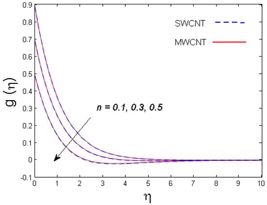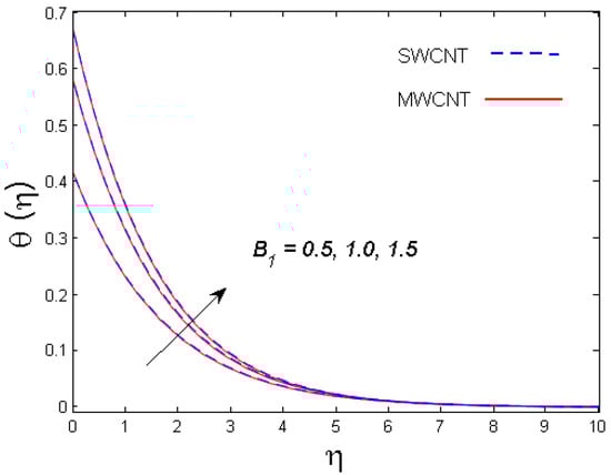 The outcome of solid volume fraction on the temperature field is evident in Figure 6. The temperature profile is enhanced with increasing estimates of the solid volume fraction of the nanoparticles. It is also understood that the thermal boundary layer thickness is enhanced by augmenting the estimation of the solid volume fraction for both nanotubes. This is all because of the enhancement in thermal conductivity of CNTs with solid volume fraction that becomes the main cause for augmented temperature. The effect of Biot number is studied in Figure 7. It is perceived that with an upsurge in , temperature distribution escalates for both SWCNT and MWCNT. Physically, larger estimates of means more thermal resistance inside the cone in comparison to the boundary layer; consequently, a higher temperature of the fluid in the boundary layer area is witnessed. Figure 8 shows the influence of radiation parameter on temperature profile. It was determined that larger values of result in more energy being produced, which eventually raises the temperature of the fluid.