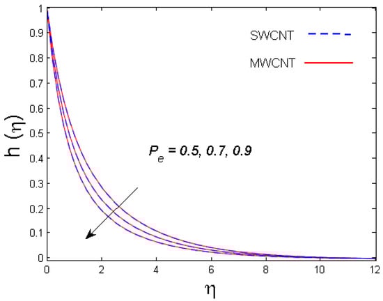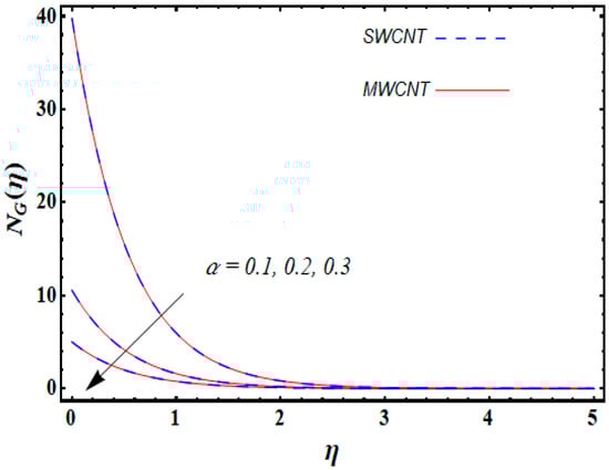 The impact of numerous parameters on the concentration field is presented in Figure 9 and Figure 10. Figure 9 depicts the influence of Schmidt number on concentration distribution for both nanotubes. It is understood from the figure that the concentration field is a diminishing function of . Since the Schmidt number is the proportion of kinematic viscosity and the molecular diffusion coefficient, higher values of leads to a reduced molecular diffusion that ultimately lowers the concentration of the fluid. In Figure 10, the graph of concentration profile versus the solutal stratification is depicted. It is clear that for improved values of , the concentration of the fluid is diminished for both SWCNT and MWCNT nanotubes. In actuality, the lowering of concentration field is due of the concentration differences between the ambient fluid and the surface of the cone.