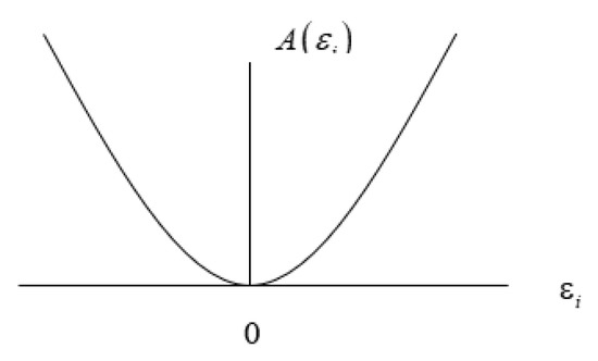 Since , Equation (7) can be rewritten as . In proving that is non-negative, because , it is only necessary to prove that . Taking the first-order derivative of is: . This is obvious that this derivative disappears when . In addition, the derivative is positive when and negative when . However, regardless of the value of , negative or positive, the function is always positive as long as is a small number. It is clear that when , and when , and the function looks like below. In short, as presented in Figure 1 below, the function so that and the equality sign holds when and only when each disappears, that is, when for all . It means that the expected information of an indirect message disappears when all probabilities are left unchanged.