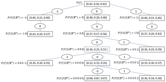 To obtain , the learning algorithm constructs a context tree where each node holds a set of ordered counters that represent the distribution of symbols that follow that context, which is defined by the path to that node [10]. At the next step, a pruning procedure is performed to leave only those contexts in (also called optimal contexts [10]), with corresponding nodes in the tree that represent the conditional distribution of the output variable conditioned on the context, which is different from the distributions of the output variable conditioned only on part of the context. This difference between the conditioned distributions is measured by the measure. The pruning phase is regulated by the pruning constant c, which is a tunable hyper-parameter. As proven by [9], this procedure leads to the optimal description of the tree source, e.g., one with the minimal description length of the generating tree source. Descriptions of the main principles of the CT Algorithm, how to obtain , and a numerical example appear in Appendix A.
