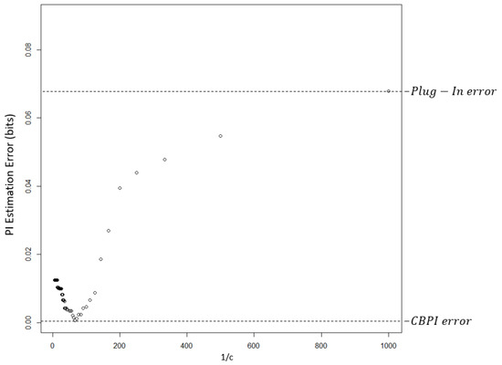 The dependency of the estimation error on c in a randomly-chosen single run is demonstrated in Figure 2. The smallest estimation error was obtained by the CBPI algorithm with a c value that corresponds to approximately . The error at the right edge of this figure is equal to the error of the plug-in method.