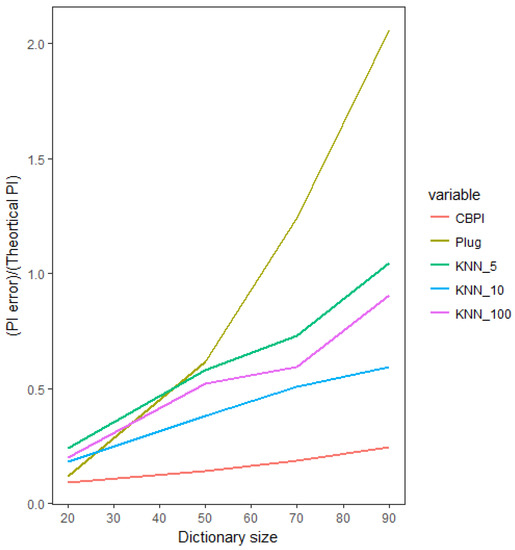 We now investigate the estimation error, as a function of the sparsity of the significant patterns in the data. In the following setup, we have an input time series with an increasing size of alphabet and a binary output time series. In every run, we chose two symbols to be the informative symbols. The probability of symbols in the output time series, conditioned on the first informative symbol in the input time series, is [0.1, 0.9] for “0” and “1” output symbols, respectively. Similarly, the conditioned probability of symbols in the output time series conditioned on the second informative symbol is . All the other conditioned probabilities are equal to (see Table 4 for the key parameters of this simulation study). This setup allowed us to compute the true theoretical PI value and compare it to the numerically-calculated results. In Figure 3, we compare the CBPI against the best benchmark method from the previous setup, namely the K-NN with various values of K, as well as against the commonly-used plug-in method. In the small number of symbols (low sparsity), the estimation error of the CBPI and the plug-in methods were relatively equivalent (although it is worth mentioning that even in a non-sparse situation with a small alphabet, the CBPI resulted in a smaller PI error), whereas the K-NN error based on all K values was higher. As the alphabet size increased (hence, increasing the sequence sparsity condition), the CBPI resulted in a moderate increase in the estimation error, while all the other methods exhibited a much higher sensitivity to the size of alphabet, resulting in the plug-in methods being the most sensitive to such an increase with the largest error in situations of large sparsity.